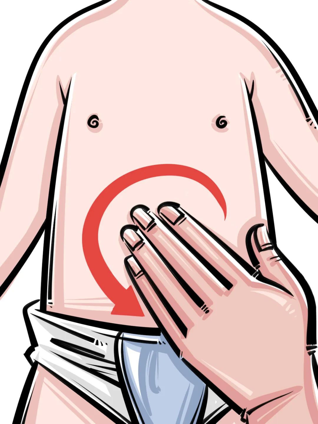 怎样操作:小宝宝躺在床上,家长用手掌面逆时针方向摩腹,就是摩腹(逆时针)。